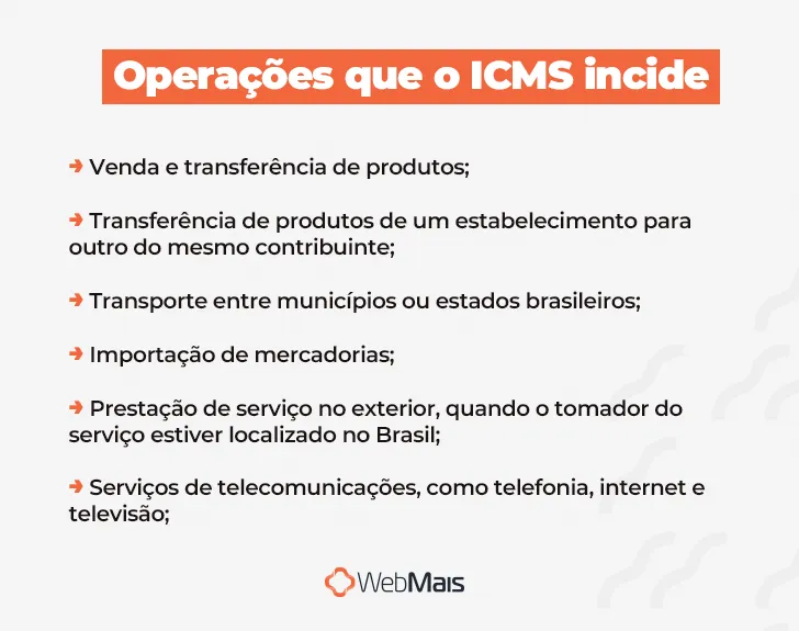 Além dessas operações, o ICMS pode incidir sobre outras, conforme legislação estadual. Por exemplo, alguns estados cobram alíquota sobre a energia elétrica, a água e o esgoto.